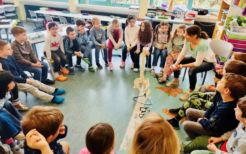 Frau Dr. Tabea Haas, Fachärztin für Orthopädie und Unfallchirurgie, führte gemeinsam mit der Klassenlehrerin Frau Huiss den Gesundheitsvormittag durch. Zu Beginn erklärte Frau Dr. Haas kindgerecht die Anatomie der Wirbelsäule und die Bedeutung von Bewegung für eine gesunde Haltung.